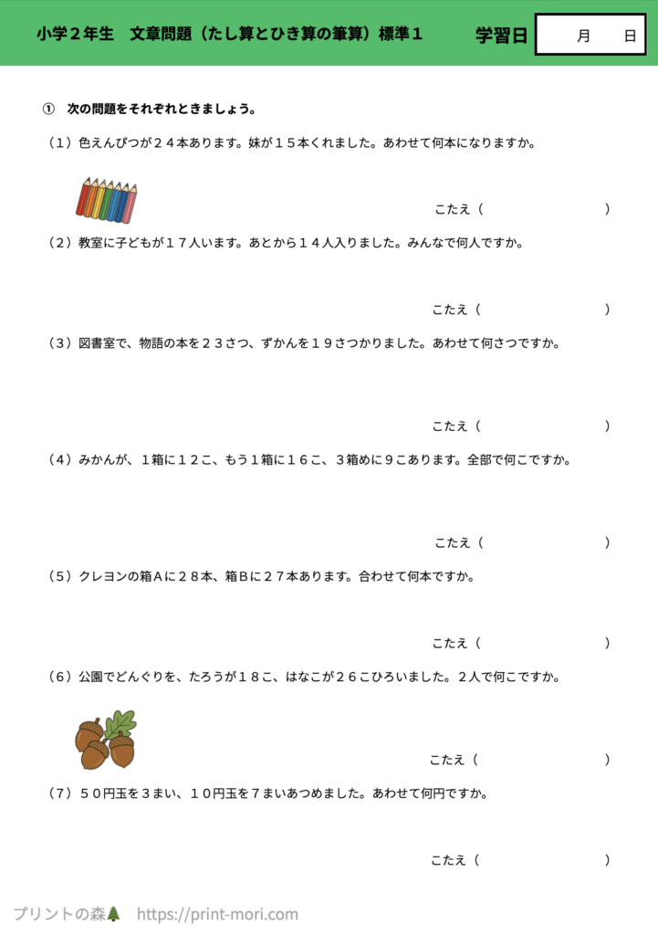 ● 文章問題(たし算とひき算の筆算)・・・・・・標準×2