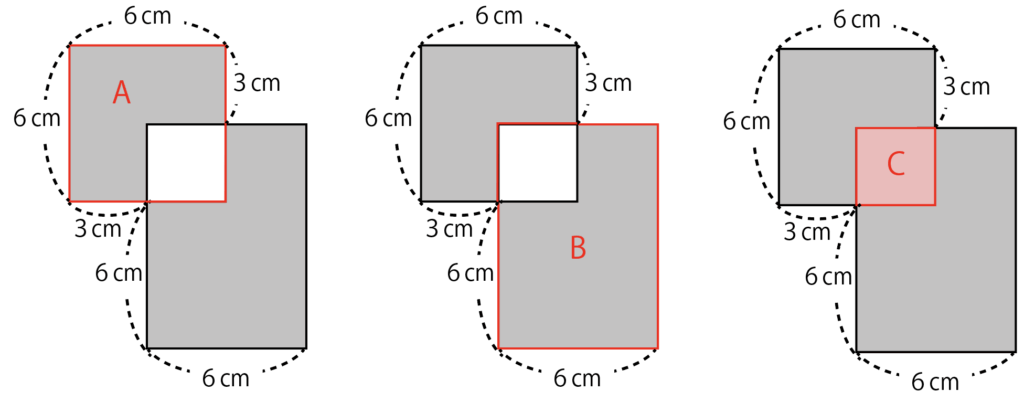 これらAとBがCの部分で共通して重なっているわけだから、Cの面積3✖️3=9㎠のAとBの2つ分を引けば良い。