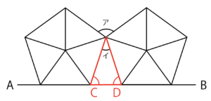上の図で赤枠の三角形に注目すると、イの角度を求めるには180°からCとDの2角を引けばいい。