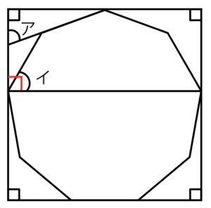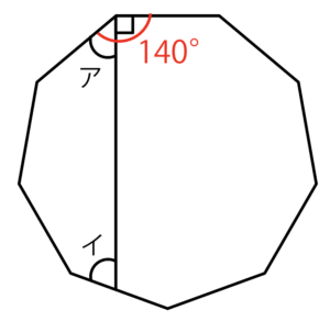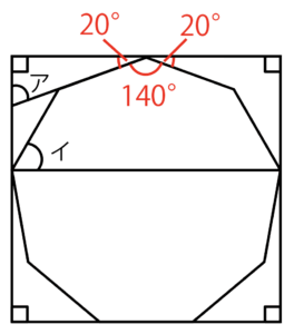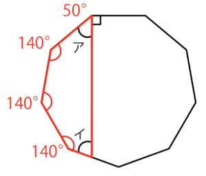 上の図のように赤枠に注目すると五角形である。アの答えは50°と出たので、五角形の内角の和540°から50+140+140+140を引いた答えがイの角度になる。