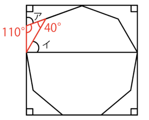 まず上の図の赤枠の三角形の注目すると、180−140で40°。次にアの解答より110°と出せる。よって残りの1角は三角形の内角の和より30°とわかる。