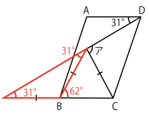 次に上の図の三角形に注目すると、二等辺三角形なので向かい合う底角も31°になる。よって内角と外角の関係より62°。