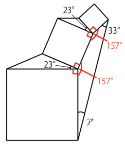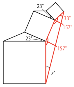 よってアの角度は360ー157ー157ー33=13°が正解。